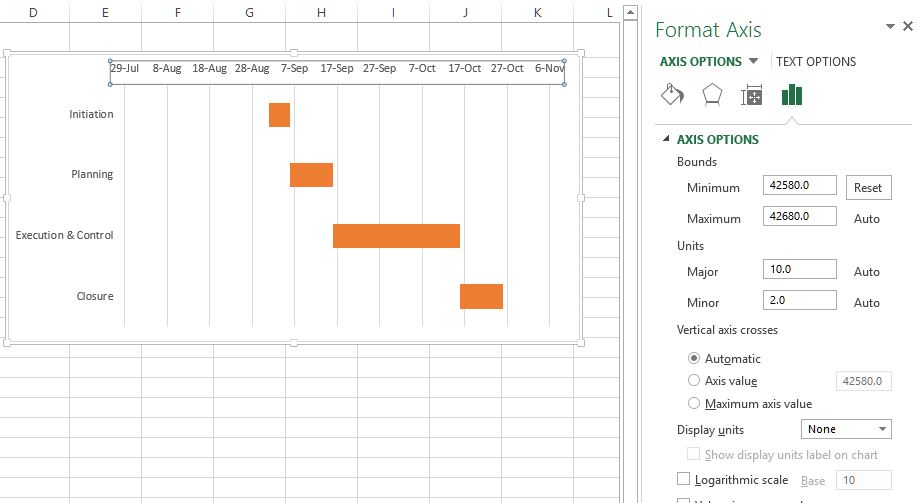 So our chart should be looking like this (this chart is final product after following step, actully the Y axis Label will be in reverse order). So click to select the Axis Labels (Initiation, Planning etc.) at the left of the chart and select 'Format Axis...', that will open right panel that will allow us to format the Axis.