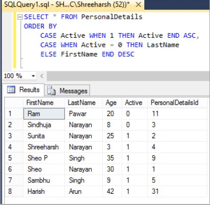 In above case, all records having Active = 1 is sorted on “Active ASC” order. All records having Active = 0 is sorted on ‘LastName DESC’ else ‘FirstName DESC’ order.