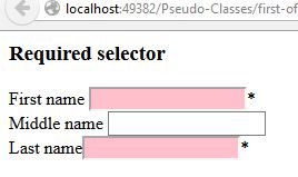 <style> input:required { background-color: pink; } </style> <body> <h3>Required selector</h3> <form> First name <input type="text" name="txt" required />*<br /> Middle name <input type="text" name="txt" /><br /> Last name<input type="text" name="txt" required />* </form> </body>